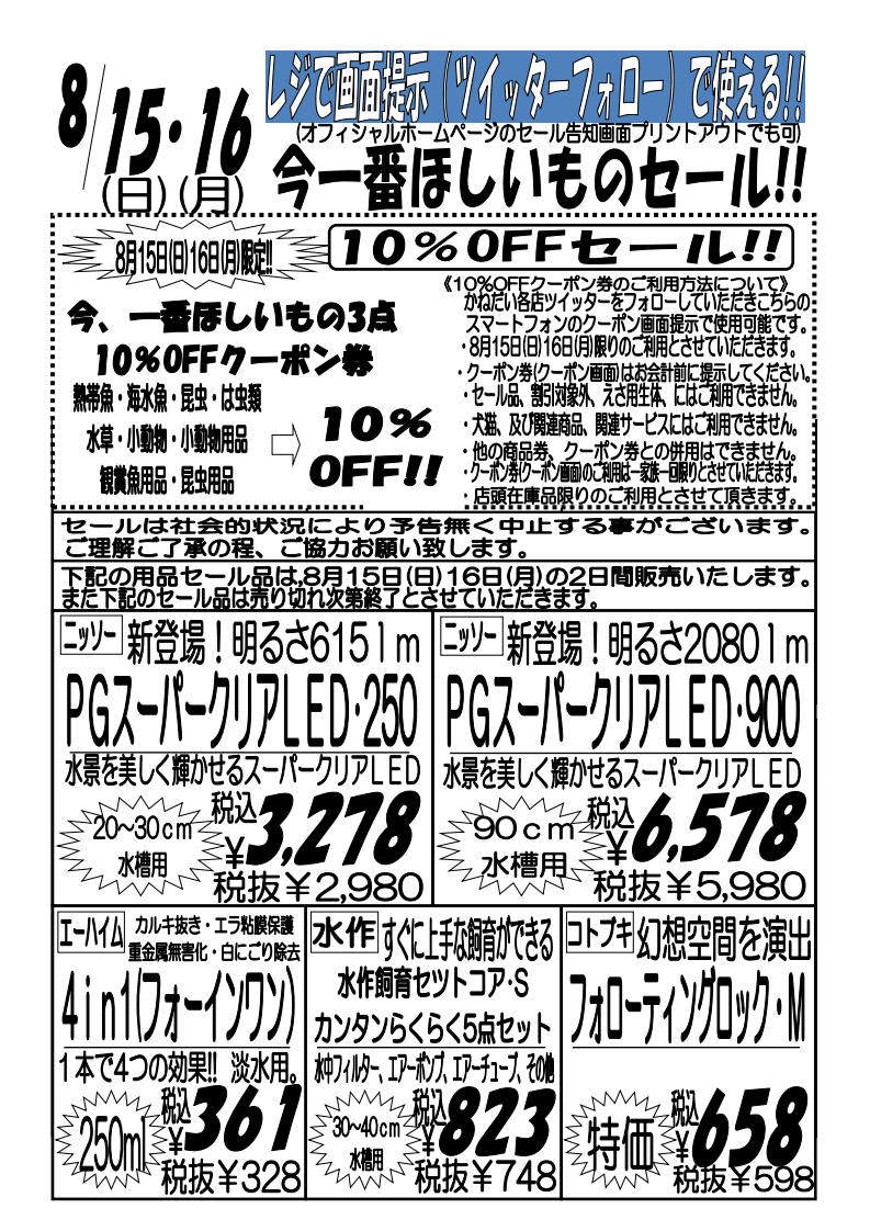 8月15日(日)〜16日(月)レジで画面提示(ツイッターフォロー)で使える!!今一番ほしいものセール!