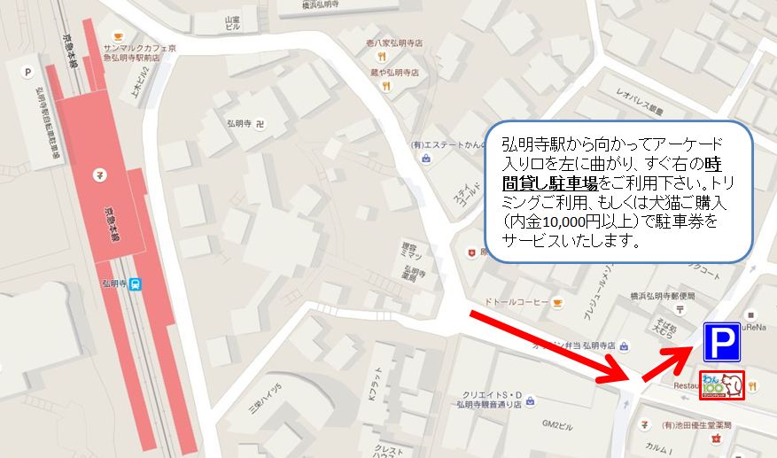 弘明寺駅から向かってアーケード入り口を左に曲がり、すぐ右の時間貸し駐車場をご利用下さい。トリミングご利用、もしくは犬猫ご購入(内金10,000円以上)で駐車券をサービスいたします。